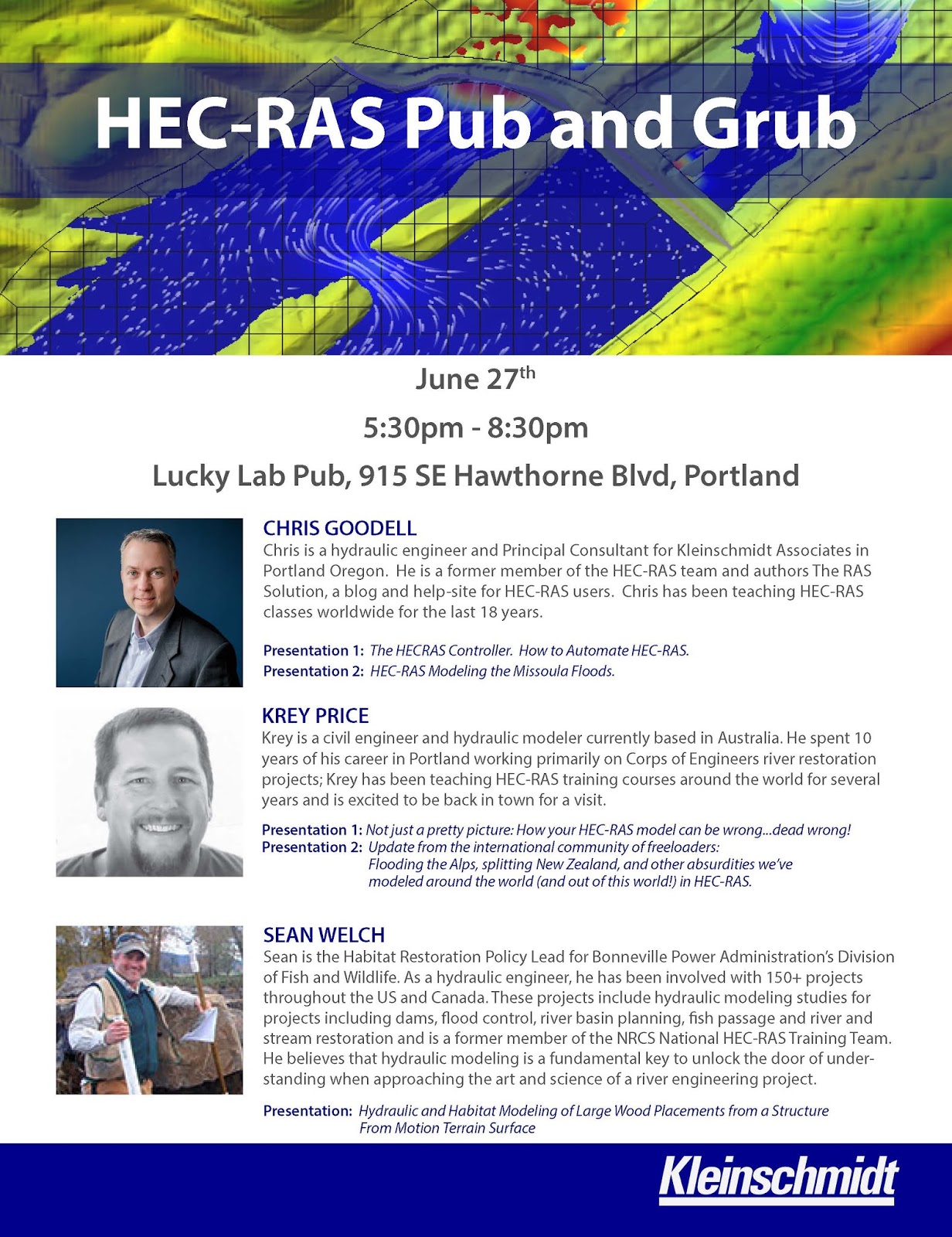 For those of you who will be in the Portland Oregon area on June 27th, I invite you to join me for this special event Kleinschmidt is hosting at the Lucky Lab on Hawthorne. I’ll be joined by two dynamic and entertaining presenters: Krey Price of Surface Water Solutions and Sean Welch of BPA. We will be talking about the fun side of hydraulic modeling, demonstrating some wild, creative, and somewhat wacky applications of HEC-RAS.