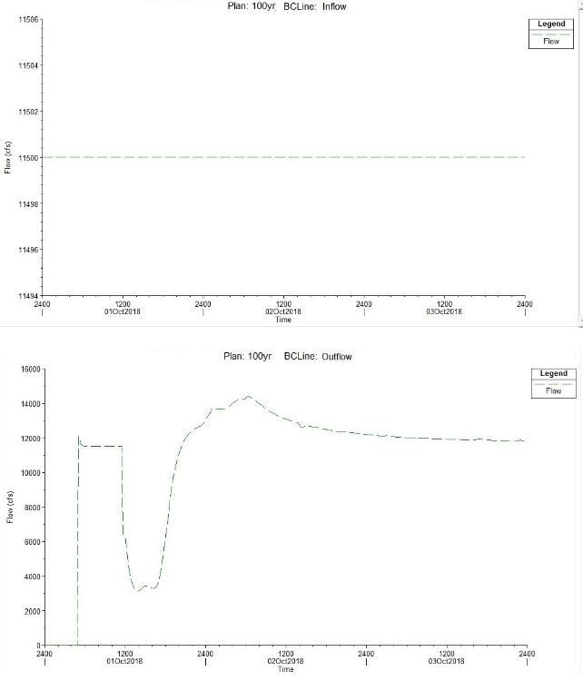 This issue is only occurring in the drainage with the inflow hydrograph. The other drainages in the 2D area with precipitation only, have normal looking hydrographs.