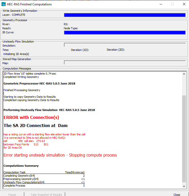 I am experiencing issues with an Outlet Rating Curve that is assigned to a 2D Area Connection between two 2D areas. I get the report as can be seen below when I try to run the analysis.