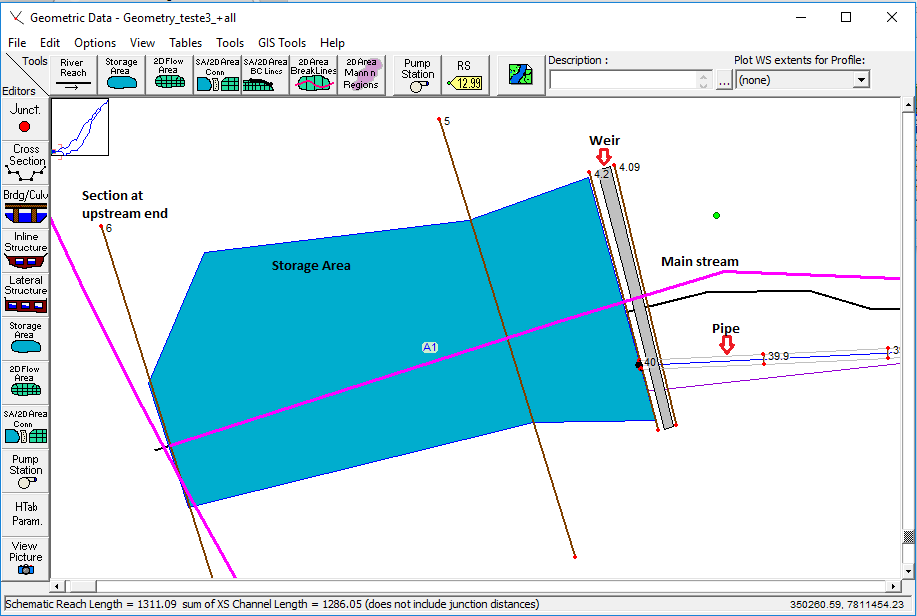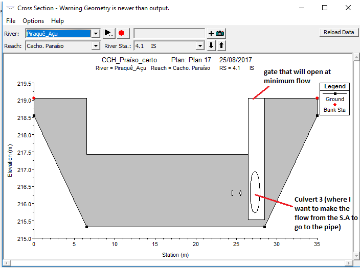 I´m trying to model a situation where I have a Storage Area between two sections and right next to it (downstream – inline structure) a Weir. In this particular Weir I made 3 culverts of diferent sizes and 1 gate. Now.. so far I think I handled quite well (I might just be wrong), but I’m having a hard time to make HEC-RAS 5.0.3 distributes the flows through this culverts, since the bigger one is supposedly going to conect with a pipe that goes to somewhere else.